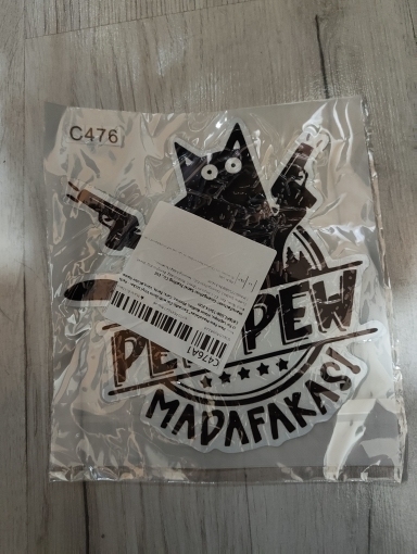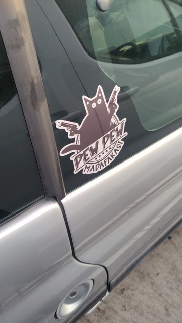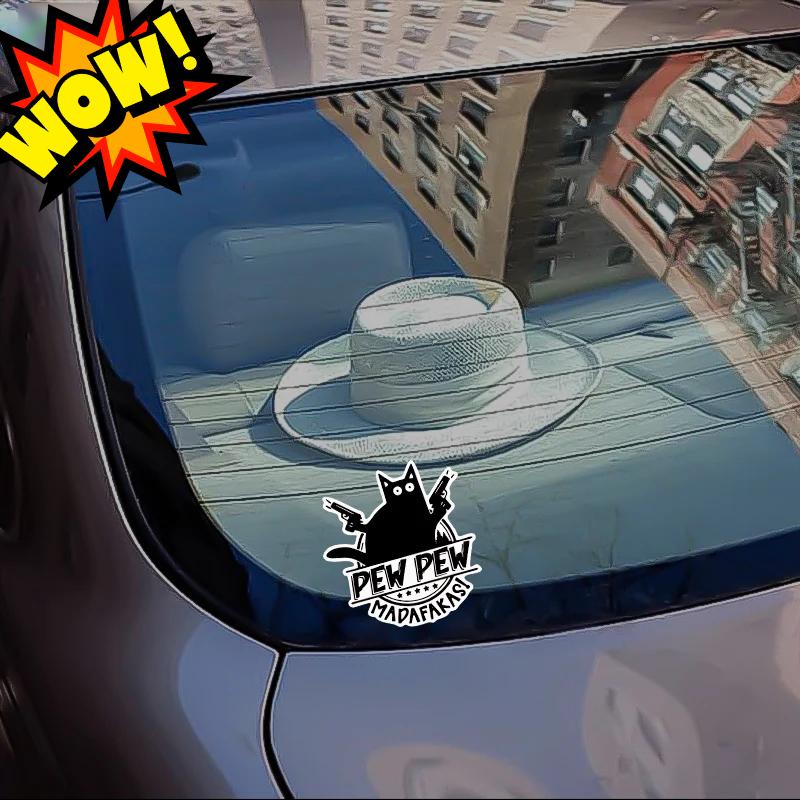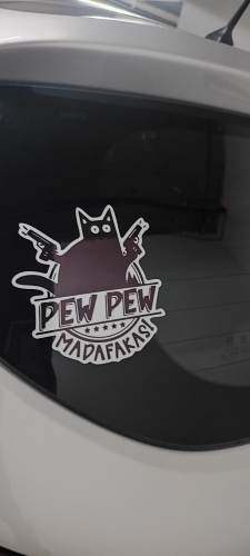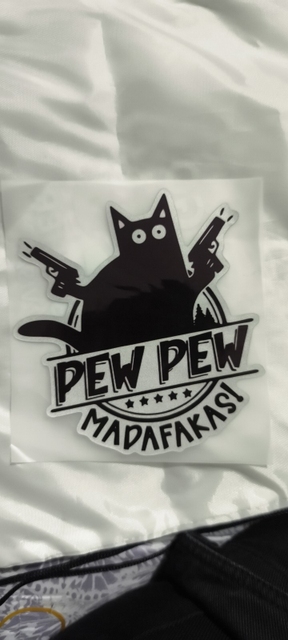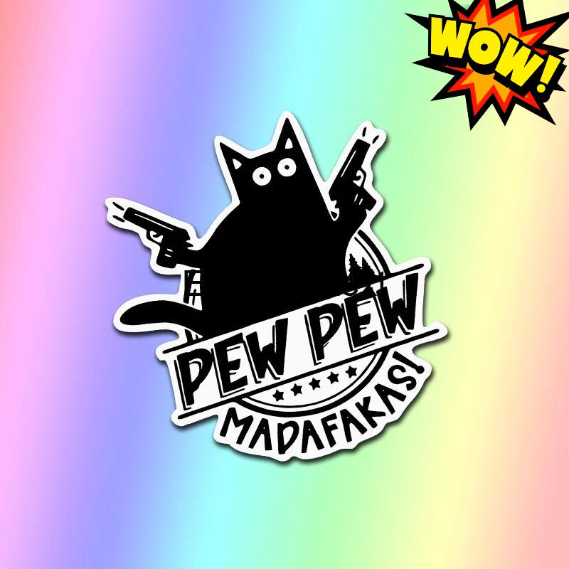 • Design: Sarcastic cat holding guns with “Pew Pew Madafakas” text