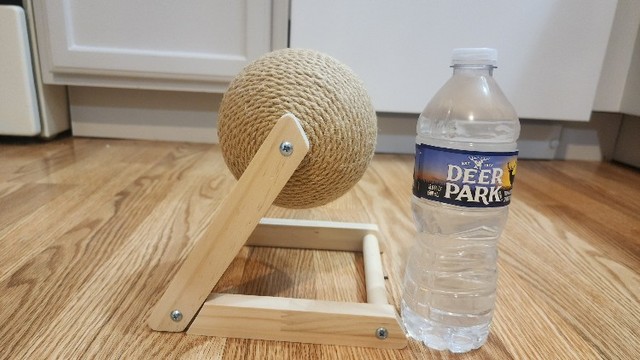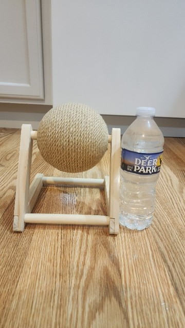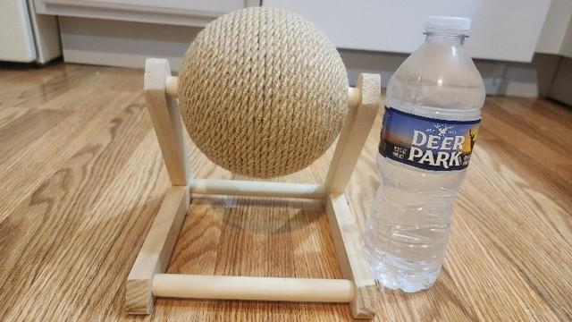 Much smaller than anticipated. For reference, the bottle of water next to the scratcher is a 500ml bottle. The scratcher is the same height as the bottle. The ball only has a diameter of four inches. This is very much meant for kittens. Also does not come with instructions, but it did come with a little screwdriver and one extra screw.