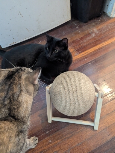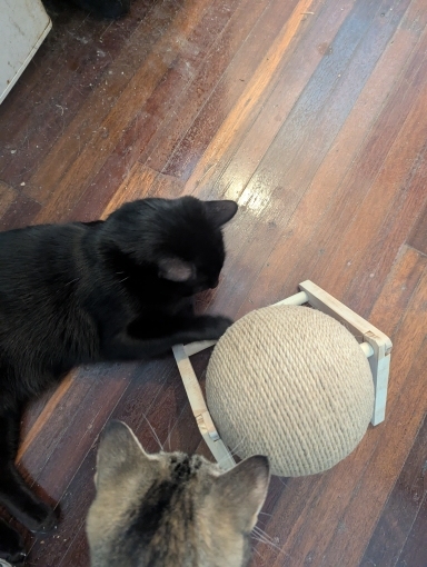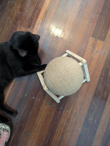 • The Cats Small Rotating Sisal Ball Scratcher helps redirect scratching away from furniture