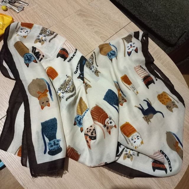 In the photo, the cats seemed larger. Nice scarf, I didn’t communicate with the store. Hope not to lose color when washing.