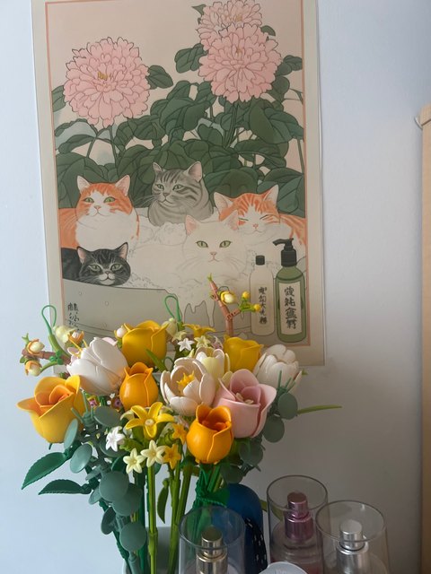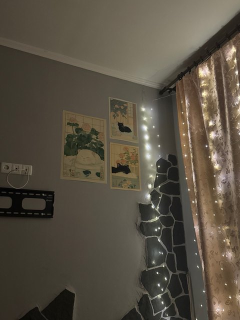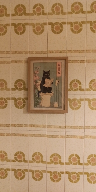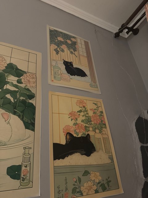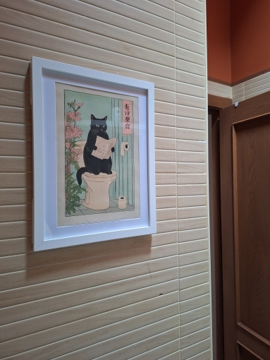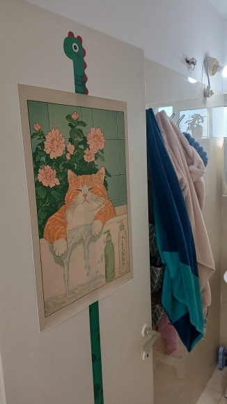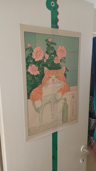 A bright poster with a cat on the door – lifts your mood every time you pass by, good quality.