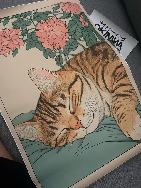 Gorgeous cat poster – actual canvas, not just a cheap print or paper, and came very well packaged in a plastic tube. I got the 30x42vm size