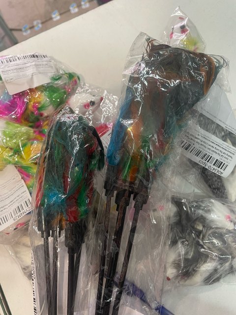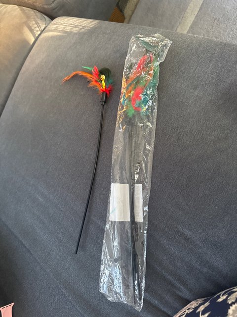 The set is excellent! The sticks are a bit shorter than I expected, but sufficient for playing with the cat. The rooster feathers are magnificent! Each stick also has a small bell. The cats are delighted! They’re waiting in line to play. Arrived exactly on time.